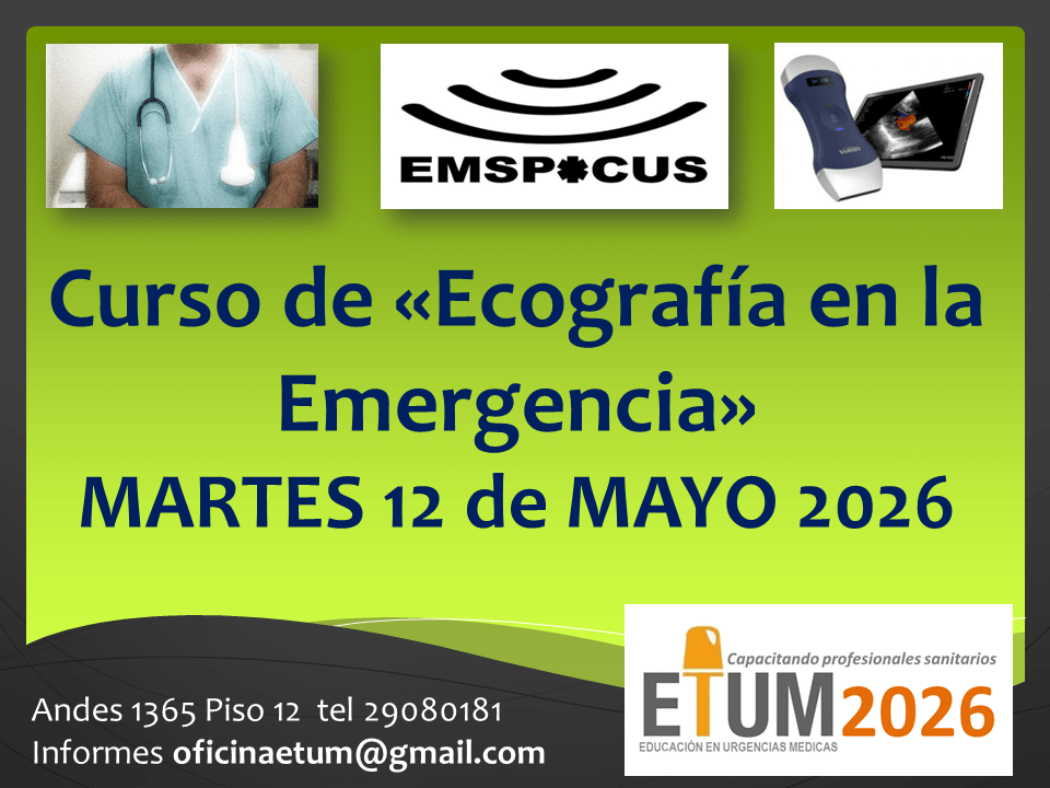Curso EMS-POCUS (Ultrasonografía focalizada en la Emergencia): Curso destinado a los profesionales de las áreas de Emergencias pre e intrahospitalarias donde la ultrasonografía focalizada permite tomar decisiones rápidas con el paciente grave en base a respuestas binarias. Los temas a desarrollar en este curso son: Principios físicos del sonido, Manejo del Ecógrafo en la Emergencia, Imágenes normales, Protocolos: FAST (Focused Abdominal Sonography for Trauma), EFAST (Extended -FAST), RUSH (Rapid Ultrasound in Shock), uso de la ecografía en el PCR (de acuerdo a las nuevas recomendaciones en RCP) y Técnicas de Accesos Vasculares ecoguiados.