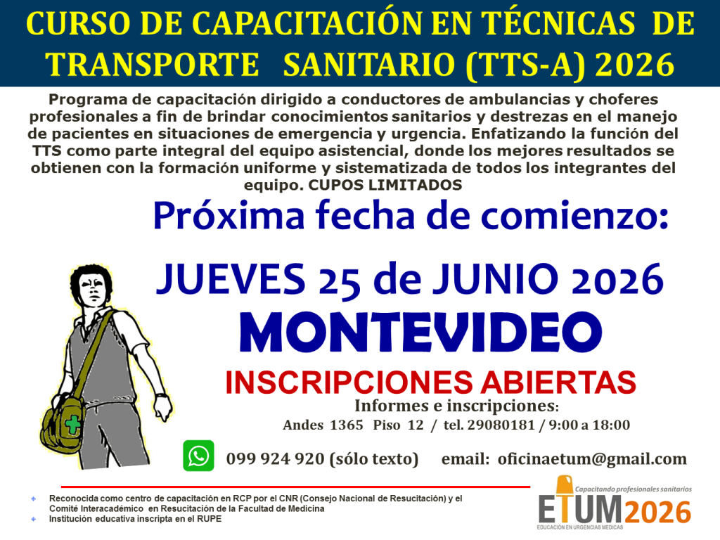 Curso TTS (Técnicas en Transporte Sanitario): Programa de capacitación dirigido a conductores de ambulancias, choferes profesionales y personas interesadas en general, con el fin de brindar conocimientos sanitarios y destrezas en el manejo de pacientes adultos en situaciones de emergencia y urgencia. Enfatizando la función del Conductor Sanitario como parte integral del equipo asistencial, donde los mejores resultados se obtienen con la formación uniforme y sistematizada de todos los integrantes del equipo. 1 clase semanal los días jueves. Total : 7 clases.